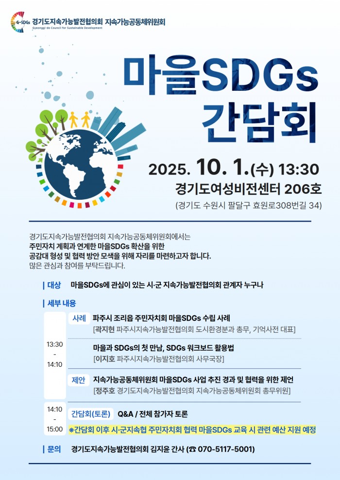 경기도지속가능발전협의회에서 주민자치 계획과 연계한 마을SDGs 확산을 위한 공감대 형성 및 협력 방안 모색을 위해 '마을SDGs 간담회'를 개최합니다.